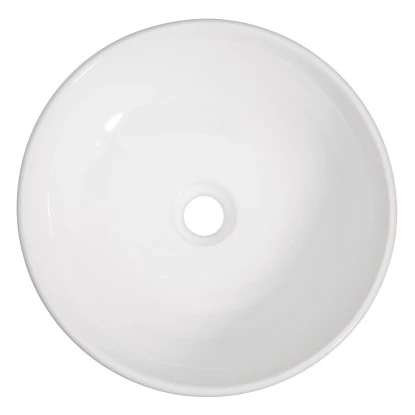 Das Aufsatzwaschbecken eignet sich zur Montage auf einem Unterbau, wie beispielsweise einer Platte, einem Waschtisch oder einem Unterschrank. Das weiße Becken ist schlicht und funktional ausgeführt. Es besteht aus Keramik. Die Oberfläche verfügt über einen Abperl-Effekt, der die Reinigung erleichtert. Das Aufsatzwaschbecken wurde ohne Hahnloch und Überlauf gefertigt. Es kann mit einer Wandarmatur oder einer Armatur mit hohem Auslauf, die neben dem Waschtisch montiert wird, ergänzt werden. Das Becken hat einen Ø von ca. 42 cm bei einer Höhe von ca. 13 cm.